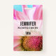 A name tag with a vibrant pink and white flower. Close up photograph of this enchanting flower really grabs your attention.