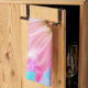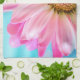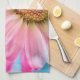Kitchen towel with a vibrant pink and white flower. Close up photograph of this enchanting flower really grabs your attention.