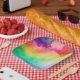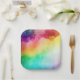 Birthday paper plates with a watercolor background featuring colours of the rainbow.