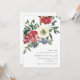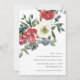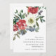 This beautiful wedding invitation features a lush watercolor bouquet with chic red, ivory white, and dusty blue flowers nestled with sage green leaves. Perfect for a modern indoor or outdoor wedding.