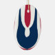 The composition is structured with alternating sections of red, white, and blue, enhancing the layered effect and creating a balanced look. The central blue shape draws the eye, while the surrounding colours provide a bold backdrop.