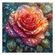 The image is a close-up of a beautiful rose with water droplets on it. The rose is in full bloom and its petals are a vibrant orange colour with hints of pink and purple. The centre of the rose is covered in small droplets of water, giving it a sparkling appearance. The leaves surrounding the rose are a mix of green and brown, and there are a few small buds scattered around the petals. The background is a dark blue, creating a contrast with the bright colours of the flowers. The overall mood of the image is peaceful and serene.