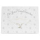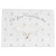 Design features an image of a descending dove holding an olive branch as full image on both sides. Your text is displayed as an arch at top in silver-coloured lettering. Background is white with the image of sparkling silver stars all around.