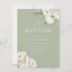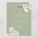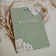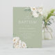 This elegant baptism invitation features a pristine sage green background, beautifully adorned with soft-hued illustrations of flowers in a delicate blend of creams and greens. Centrally placed in an inviting script font are the words "Kindly join us for a Baptism," followed by the honoured individual's name, "Georgia Monroe," in a prominent, bold typeface. Details of the event, including the date, venue, and RSVP information, are thoughtfully laid out below in a classic, easy-to-read font. The overall design exudes a sense of sophistication and grace, making it an ideal choice for commemorating such a sacred occasion.