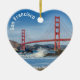The beautiful Golden Gate Bridge in San Francisco on a heart shaped ornament. Two different photographs with the iconic bridge and the downtown skyline.