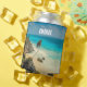 Can cooler with a beautiful photo featuring Tulum, Mexico. Turquoise waters on a sandy shore. Wind swept palm trees blowing in the breeze near a craggy cliff side. Soothing and relaxing.