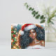 This festive postcard features a gorgeous dark-skinned woman with thick, wavy long hair wearing a Santa hat and Santa-inspired dress. A Christmas tree is in the background behind her, emphasizing the holiday theme.