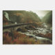 Wrapping paper with a nature photograph. Moody and beautiful landscape. A secluded stone bridge beside a lively river with waterfalls, forest and mountains surrounding the area.