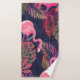 Beautiful seamless tropical pattern with pink flamingo and palm leaves on dark background. Abstract summer texture
