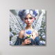 A beautiful blue haired fairy with silvery wings wearing a pretty blue dress and sapphire jewellery holds a single aster while standing in a field of asters.