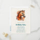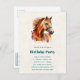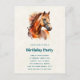 Birthday party invitation postcard with a beautiful illustration. A copper brown chestnut coloured horse head and upper body. With watercolor patches behind.