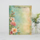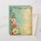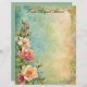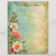 Beautiful spring flowers in pink and white cluster on the left side of this elegant letterhead stationery with a marbled blue, green, and pale peach background, and faded decorative border. The back is a complementary blue-green, echoing colours on the front.