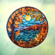 Beautiful round window cling for home or business features AI generated stained glass style Fall scene with Autumn leaves, water and cliffs in the distance. A great addition to your seasonal decor.