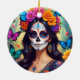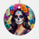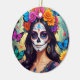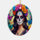 This artwork features an enchanting sugar skull, its delicate contours adorned with intricate patterns and vibrant hues. Encircling the skull is a radiant halo composed of lush, multicolored blossoms that seem to bloom from the very essence of the piece. Among the petals, butterflies in iridescent shades flutter gracefully, lending a sense of life and movement. The harmonious interplay of floral abundance and ethereal butterflies creates a striking balance between beauty, remembrance, and celebration. This captivating composition pays homage to tradition while evoking a sense of wonder and reverence.