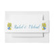 A beautiful sunflower display, this invitation belly band is ideal for a summer wedding suite. Set upon a white background the couple's name is written in the middle in lovely blue cursive text. On each side of the text are beautiful sunflowers inside of a polka dot blue and white rain boot. With easy to customise templates, personalise your wedding invitation belly bands today!