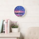 A clock with a lovely photograph featuring striking colours of purple, blue and pink at sunset.
