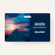 Name tag with with a gorgeous photograph. A scenic spot. A nice calm lake with a wooden dock stretching outwards. Setting sun provides beautiful colours in the sky, vibrant red and blue.