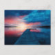 A postcard with a gorgeous photograph. A scenic spot. A nice calm lake with a wooden dock stretching outwards. Setting sun provides beautiful colours in the sky, vibrant red and blue.