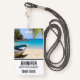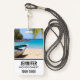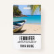 Name badge with an idyllic tropical beach scene. Turquoise blue crystal clear water and a soft brown sandy beach. Some palm leaves hanging down from above. An old wooden rowboat sits on the beach. A serene and peaceful landscape.
