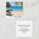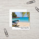 Square business cards with an idyllic tropical beach scene. Turquoise blue crystal clear water and a soft brown sandy beach. Some palm leaves hanging down from above. An old wooden rowboat sits on the beach. A serene and peaceful landscape.