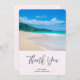 Thank you card with a photograph of a gorgeous vacation location. Bright blue sky, soft sandy beach with tropical crystal clear blue waters. A lush tree covered mountain in the background. Scenic and tranquil photography.