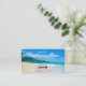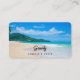 Business cards with a photograph of a gorgeous vacation location. Bright blue sky, soft sandy beach with tropical crystal clear blue waters. A lush tree covered mountain in the background. Scenic and tranquil photography.
