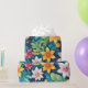 Beautiful tropical vibes floral pattern with light and dark pink and orange flowers on a dark blue background which has blue and green leaves. Nature inspired, bright, colourful wrapping paper.