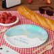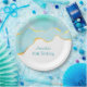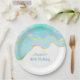 Paper plates with a vibrant summery design. Turquoise / aqua green watercolor image with a wavy faux gold border. Elegant and lovely.