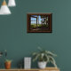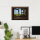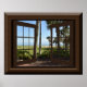 This poster features a beautiful scene of tropical palm trees and the ocean through an open window.
