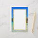 Stationery paper with a photograph of a turquoise blue ocean beach with big rocks scattered along the coast. Bright and sunny tropical locale. A white rectangle with a faux gold foil border layered over top to write inside.