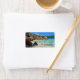Address labels with a photograph of a turquoise blue ocean beach with big rocks scattered along the coast. Bright and sunny tropical locale.