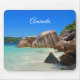 A mouse pad with a photograph of a turquoise blue ocean beach with big rocks scattered along the coast. Bright and sunny tropical locale.