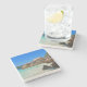 A stone coaster with a photograph of a turquoise blue ocean beach with big rocks scattered along the coast. Bright and sunny tropical locale.