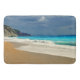 A bath mat with a beautiful photograph featuring a turquoise blue sea and a sandy beach with waves of foamy surf.
