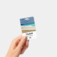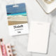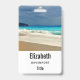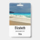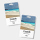 Personalised name badge with a beautiful photograph featuring a turquoise blue sea and a sandy beach with waves of foamy surf.