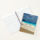 A personalised spiral notebook with a beautiful photograph featuring a turquoise blue sea and a sandy beach with waves of foamy surf.