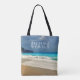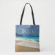 A personalised tote bag with a beautiful photograph featuring a turquoise blue sea and a sandy beach with waves of foamy surf.