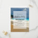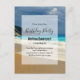 Birthday party or other event invitation with a beautiful photograph featuring a turquoise blue sea and a sandy beach with mountains in the back.