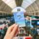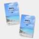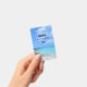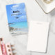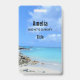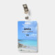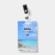 Name badge with a scenic tropical photograph. A secluded beach with white sand and turquoise water.