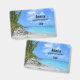 Name badge with a scenic tropical photograph. A secluded beach with white sand and turquoise water.