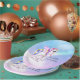 Paper plates with an image of a unicorn with big blue eyes, pink wings and a rainbow mane and tail. Kawaii cute.
