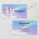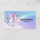 Business cards with an image of a unicorn with big blue eyes, pink wings and a rainbow mane and tail. Kawaii cute.