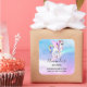 Business stickers with an image of a unicorn with big blue eyes, pink wings and a rainbow mane and tail. Kawaii cute.