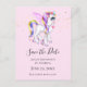 Save the date postcard with an image of a unicorn with big blue eyes, pink wings and a rainbow mane and tail. Kawaii cute.