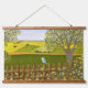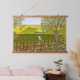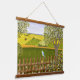 A tapestry with a beautiful image of a nature scene: A bird sitting on a weathered fence, wildflowers growing around the fence, a farmer on a tractor, working his land, trees with leaves, and farmland with various colours. Original artwork by W.B.
