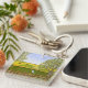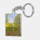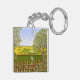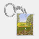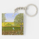 A key chain with a beautiful image of a nature scene: A bird sitting on a weathered fence, wildflowers growing around the fence, a farmer on a tractor, working his land, trees with leaves, and farmland with various colours. Original artwork by W.B.