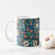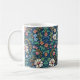 Beautiful flowers, rich gold accents, and green foliage on a dark blue background creates a Baroque-style coffee mug that is perfect for anyone who loves flowers and William Morris prints.