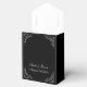 Beautiful vintage wedding black gala party Favour Boxes. Perfect for thanking guests with a treat or gift. Classy typography template for couple getting married. Change quantity to get the cheap bulk price. Classical formal template for high end wedding in retro style. Flourish border design with swirls. Personalised tent shape box with white or black tie options.