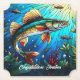 This fun modern design has a colourful walleye pike swimming in a beautiful blue lake on a sunny day.