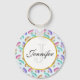 A keychain with a beautiful pattern. Watercolor butterflies, painted in pastel colours including pink, purple, blue, yellow and green. A light blue watercolor background with hints of light pink. Place your name and monogram letter inside a white circle with a faux-gold foil border.